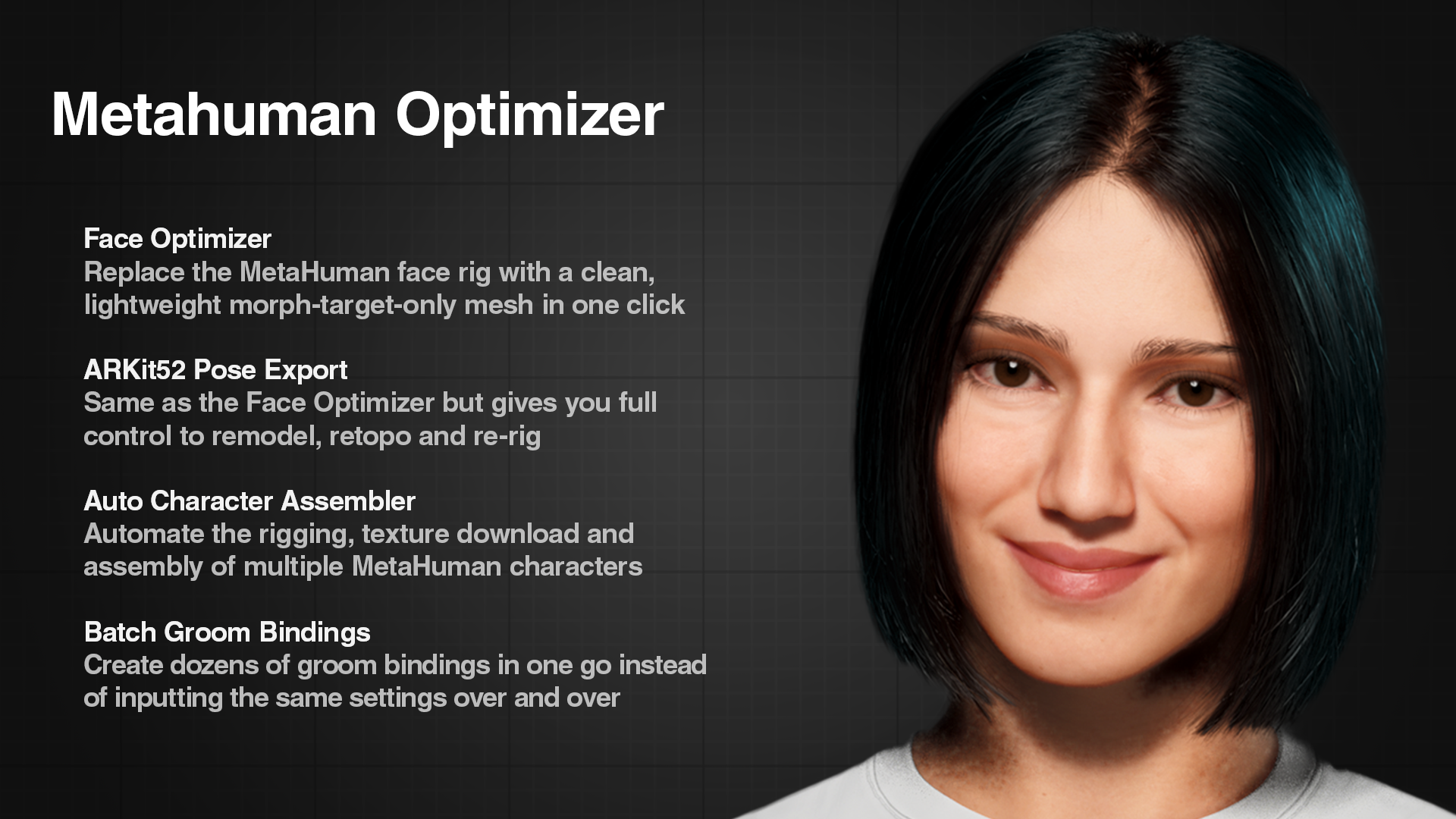 MetaHuman Optimizer An Unreal Engine 5.7 editor plugin for optimizing MetaHuman workflows: build morph-target faces, export ARKit poses, batch-assemble characters, and bind groom assets, all from a single editor window.